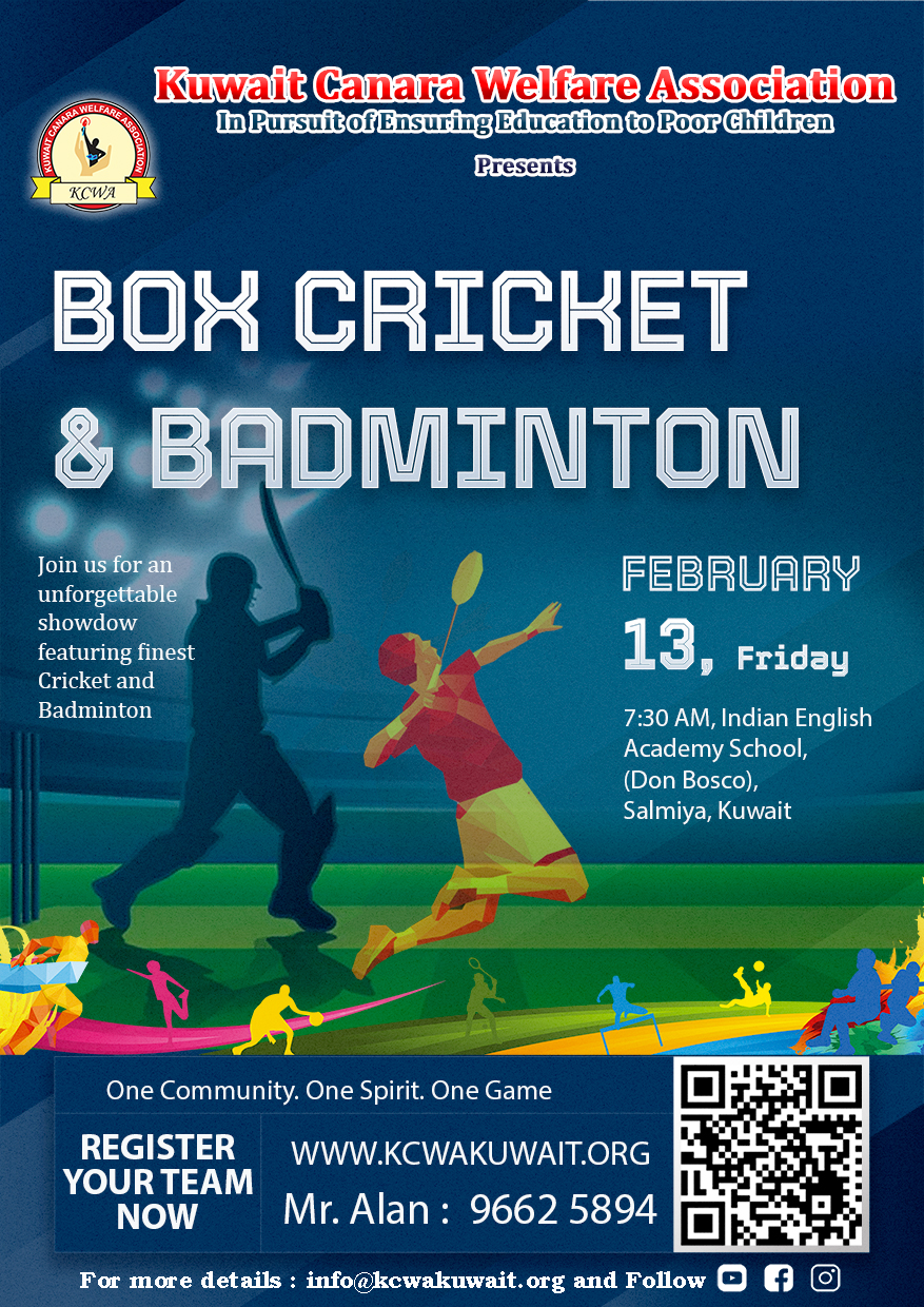 KCWA is pleased to announce the most awaited “KCWA Box Cricket and Badminton Tournament-2026” to be held on Friday, 13th February 2026, from 7:30 am onwards at Indian English Academy School (Don Bosco), Salmiya. Box cricket and Badminton tournaments will be organized based on members’ requests at the General Body Meeting, while the annual outdoor cricket tournament will continue as usual and will be held soon.
